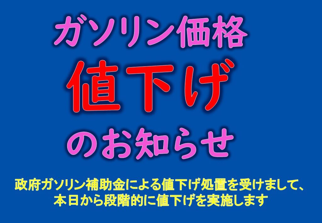 政府ガソリン補助金による値下げ処置を受けまして、本日から段階的に値下げを実施しております。