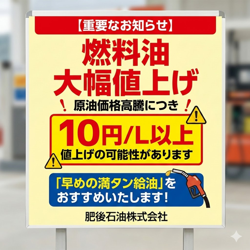 先週までは、販売店への仕入れ価格について、来週から6円/L程度の値上げと予想しておりましたが、本日時点で、20円/L高くなる予想と連絡がありました。