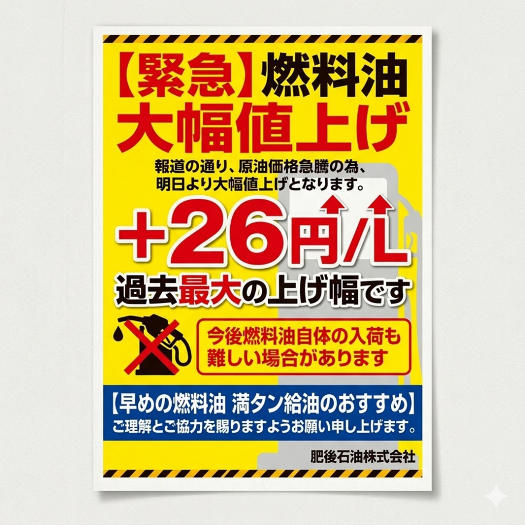 明日(3/12)からの価格が元売り各社から発表され、過去最大の上げ幅である全油種+26円/Lとなりました。